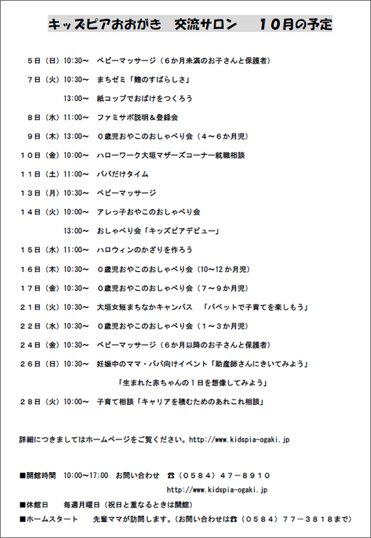 ◆5日(日) 10:30〜 ベビーマッサージ(6か月未満のお子さんと保護者) ◆7日(火) 10:30〜 まちゼミ「麹のすばらしさ」 ◆7日(火) 13:00〜 紙コップでおばけをつくろう ◆8日(水) 11:00〜 ファミサポ説明&登録会 ◆9日(木) 13:00〜 0歳児おやこのおしゃべり会(4〜6か月児) ◆10日(金) 10:00〜 ハローワーク大垣マザーズコーナー就職相談 ◆11日(土) 11:00〜 パパだけタイム ◆13日(月) 10:30〜 ベビーマッサージ ◆14日(火) 10:00〜 アレっ子おやこのおしゃべり会 ◆14日(火) 13:00〜 おしゃべり会「キッズピアデビュー」 ◆15日(水) 11:00〜 ハロウィンのかざりを作ろう ◆16日(木) 10:30〜 0歳児おやこのおしゃべり会(10〜12か月児) ◆17日(金) 10:30〜 0歳児おやこのおしゃべり会(7〜9か月児) ◆21日(火) 10:30〜 大垣女短まちなかキャンパス「パペットで子育てを楽しもう」 ◆22日(水) 10:30〜 0歳児おやこのおしゃべり会(1〜3か月児) ◆24日(金) 10:30〜 ベビーマッサージ(6か月以降のお子さんと保護者) ◆26日(日) 10:30〜 妊娠中のママ・パパ向けイベント「助産師さんにきいてみよう」「生まれた赤ちゃんの1日を想像してみよう」 ◆28日(火) 10:00〜 子育て相談「キャリアを積むためのあれこれ相談」 ※詳細につきましてはホームページをご覧ください。 https://www.kidspia-ogaki.jp ∵*―――――――*∵*―――――――*∵* ◆開館時間:10:00〜17:00 ◆お問い合わせ:TEL(0584)47-8910 ◆休館日:毎週月曜日(祝日と重なるときは開館) ◆ホームスタート:先輩ママが訪問します (お問い合わせはTEL(0584)77-3818まで) |