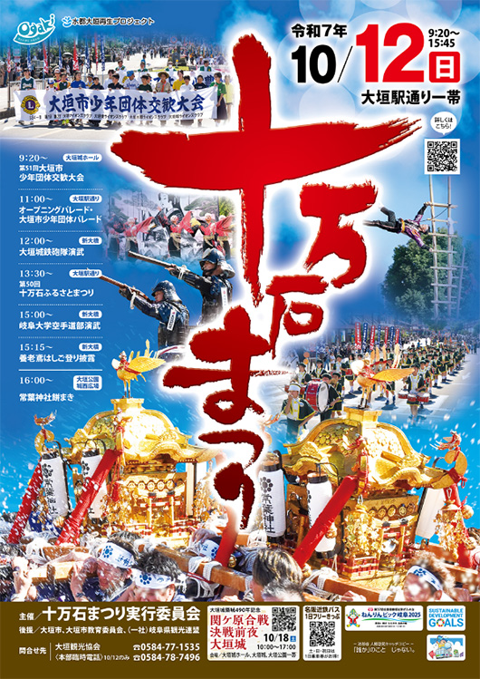 歴代大垣藩主を祀る常葉神社の例祭である「十万石まつり」及び各種関連行事を開催します。 ◆オープニングパレード・少年団体パレード フレンドリーシティ日置市のパレード行列、大垣商業高等学校のマーチングバンド、岐阜大学のチアリーディング、地元のスポーツ少年団員パレードが行われます。 ◆大垣城鉄砲隊演武 昭和60年の「大垣藩戸田公入城350年祭」を機に組織された大垣城鉄砲隊により火縄銃の発砲(空砲)の演武を披露します。 ◆十万石おどり・民踊交歓大会 地元女性団体により、大垣音頭などの地元民踊が披露されます。 ◆第50回十万石ふるさとまつり 子ども・大人・企業みこし 常葉会による神輿の渡御のほか、地元児童・各種団体・企業による神輿の練り歩き、岐阜大学学生によるよさこいを行います。 ◆岐阜大学空手道部演武 架空の相手を想定した技の攻防を披露します。 ◆養老鳶はしご登り 竹と木材で作ったはしごの上で演技を披露します。 ◆第51回大垣市少年団体交歓大会 記念品の贈呈およびレクリエーションが行われます。 ◆常葉神社神事 大垣藩十万石の城主を祀る常葉神社の例祭が開催されます。 ◆お菓子即売と抽選会 お菓子の即売と抽選会が行われます。 ◆ハーレー展示 ハーレーダビッドソンの展示を行います。 ◆常葉神社神輿渡御 常葉神社神輿の練り歩きが行われます。 ◆常葉神社餅まき 十万石まつり参加者を対象とした餅まきが開催されます。 ◆日置市観光PR・物産展 フレンドリーシティ日置市の観光案内および物産展が行われます。 ◆十万石まつりクリーン作戦 十万石まつり会場の清掃活動を実施します。 ---------------------------------------------- ※詳しくは、ホームページでご確認ください。 https://www.ogakikanko.jp/event/jumangokumaturi/ ---------------------------------------------- |
