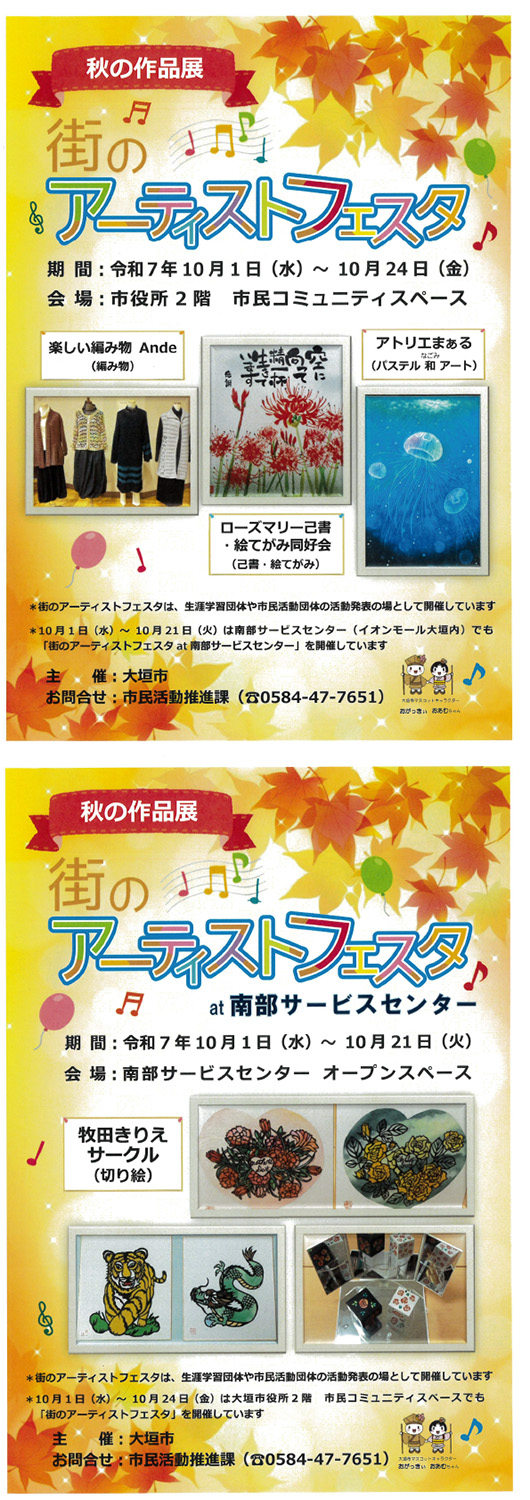 生涯学習団体や市民活動団体の活動成果の発表の場として「街のアーティストフェスタ」を開催します。 今回は「秋の作品展」として、市内で活躍する4団体のアート作品を展示し、華やかに彩ります。 【市役所2階市民コミュニティスペース】 とき/10月1日(水)〜24日(金) 8:30〜17:15 ※土・日・祝日は除く。最終日は15:00まで 展示内容/編み物、パステル和(なごみ)アート、己書、絵てがみ 【南部サービスセンターオープンスペース(イオンモール大垣2階)】 とき/10月1日(水)〜21日(火) 10:00〜21:00 ※最終日は15:00まで 展示内容/切り絵 |