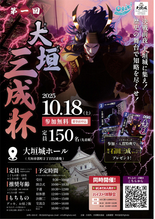 歴史を楽しく学びながら遊ぶことができるカードゲーム「Hi!story(ハイストーリー)」の勝ち抜き戦による公式大会「大垣三成杯」を開催します。 とき/10月18日(土) 【予選】午前10時30分〜正午 【決勝トーナメント】午後1時〜3時 ところ/大垣城ホールアリーナ(南側) 定員/150人(先着順) ※大人の部:30人、子どもの部:120人 持ち物/ハイストのデッキ(当日貸出あり)、昼食(大垣公園に飲食ブースもあり) 備考/参加者全員に「石田三成カード」をプレゼント(上位入賞者のみ入賞特典あり)、西軍武将カード封入の会場限定パックを販売 <初心者向け「ハイスト」体験会> とき/10月18日(土) 【第1部】午前10時30分〜正午 【第2部】午後1時〜3時 ところ/大垣城ホールアリーナ(南側) 定員/各20人(先着順) 持ち物/ハイストのデッキ(当日貸出あり) 申込/公式大会、体験会ともに、申込ページから申込 https://peatix.com/event/4540236?utm_source=qrcode&utm_medium=flyer&utm_campaign=20251018-ogakimitsunari1 |
