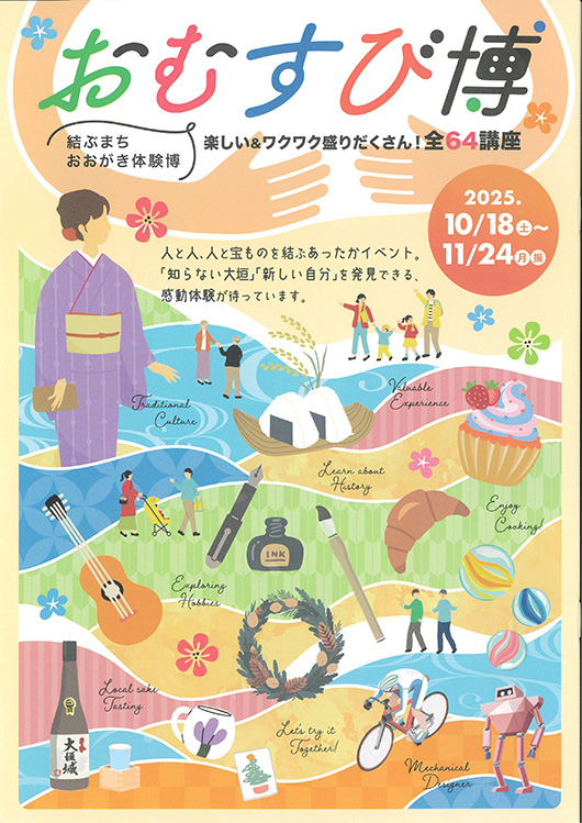 大垣市が誇る「歴史・文化」「自然」「食」などをテーマとした参加型体験講座の博覧会です。約1か月にわたり大垣市内の各所で開催。感動体験を通して地域の魅力を発信すると共に、地域の人と人、団体と企業を結び、新たな地域の魅力を創出することを目指します。 ---------------------------------------------- ※詳しくは、ホームページでご確認ください。 https://omusubihaku.com/ ---------------------------------------------- |