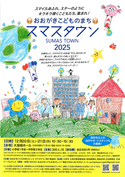 子供たちが「市民」になり、遊びながら「まち」をつくり、「まち」を学びます。おしごとセンターで仕事を探し、働き、銀行で給料「マス」をもらい、買い物したり、遊んだりと自由に市民として過ごします。 さぁ、スマスタウンへレッツゴー! ※要参加申込 対象/小学1年生〜中学3年生 定員/200人/日 参加費/各日500円(保険料込) ---------------------------------------------- ※お申込みなど、詳しくはホームページでご確認ください。 https://sumas-town.com/ ---------------------------------------------- |
