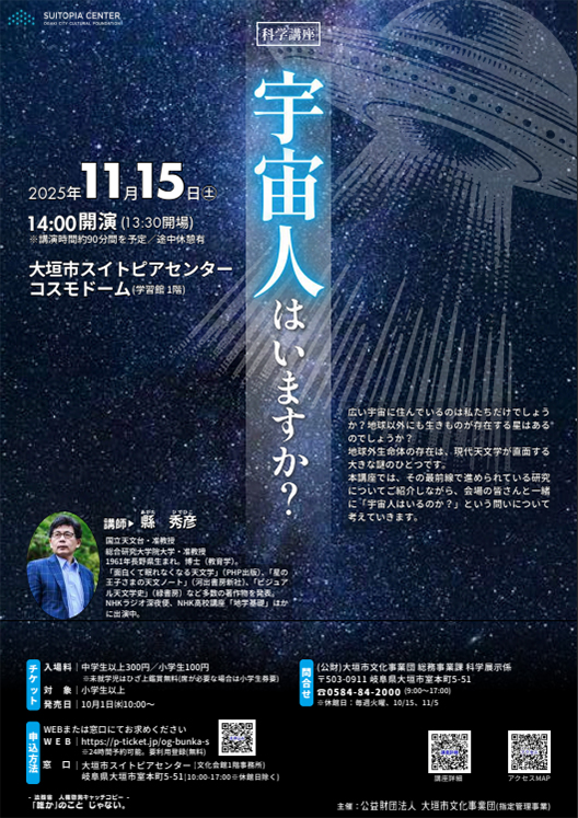 ◆宇宙人の謎に迫る!現代天文学の最前線 広い宇宙に住んでいるのは私たちだけでしょうか? 地球以外にも生きものが存在する星はあるのでしょうか? 地球外生命体の存在は、現代天文学が直面する大きな謎のひとつです。 本講座では、その最前線で進められている研究についてご紹介しながら、会場の皆さんと一緒に「宇宙人はいるのか?」という問いについて考えていきます。 ◆講師 縣 秀彦 (国立天文台・准教授/総合研究大学院大学・准教授) ◆入場料 中学生以上 300円 小学生 100円 未就学児はひざ上鑑賞無料 ◆対象 小学生以上 ◆注意事項 ・当日、コスモドームの定期上映は中止となります。 ・申込後のキャンセル(当日清算)は、必ず事前にお電話でご連絡ください。 ・席が必要な場合は未就学児でも小学生チケットの購入が必要です。 ◆チケット購入 窓口発売日:2025年10月1日(水)10:00〜 Web発売日:2025年10月1日(水)10:00〜 ---------------------------------------------- ※お申込みなど詳しくは、ホームページでご確認ください。 https://www2.og-bunka.or.jp/event/data_1426.html ---------------------------------------------- |