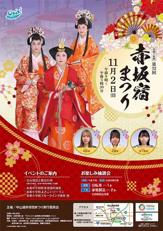 江戸と京を結ぶ中山道の宿場町として栄えた赤坂。 江戸時代末期に徳川第14代将軍家茂のもとへ降嫁した皇女和宮の行列などの姫宮行列を市民が再現するほか、県産品及び地元商店物産市なども開催します。 ---------------------------------------------- ※詳しくは、ホームページでご確認ください。 https://www.ogakikanko.jp/event/akasakashuku_maturi/ ---------------------------------------------- |