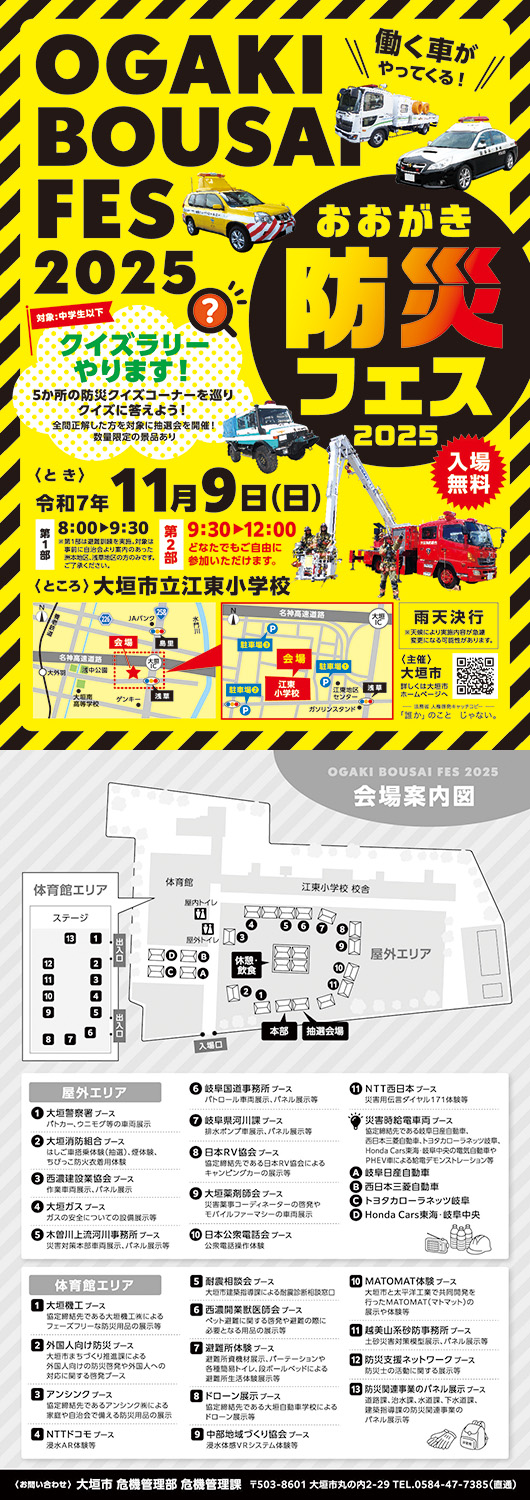 ◆車両展示 災害時等に活躍する車両の展示を行います。 乗車体験を行える車両もあります。 【展示車両】 ウニモグ、パトカー、はしご車、対策本部車 道路パトロールカー、排水ポンプ車、電気自動車 モバイルファーマシー、キャンピングカー など ◆体験・展示ブース 防災に関する体験を通して、楽しみながら防災について学ぶことができるブースを設置します。 ・自分のいる場所が浸水した際の状況をVRやARによって疑似体験できるブース ・電話を用いて音声による伝言板の役割を果たす「災害用伝言ダイヤル171」の操作体験 ・公衆電話の操作体験 ・避難所で使用する段ボールベッドなどの組み立てを行う避難所生活体験 ・ドローンの展示 など ◆クイズラリー 会場内にあるクイズに答えて、すべてのクイズに回答した方は抽選会に参加できます。 参加対象者:中学生以下の来場者 ---------------------------------------------- ※詳しくは、ホームページでご確認ください。 https://www.city.ogaki.lg.jp/0000068549.html ---------------------------------------------- |