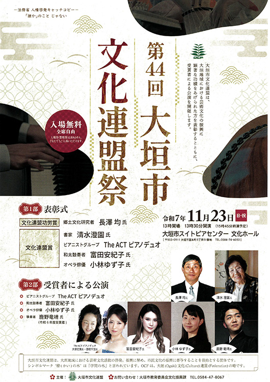 大垣市文化連盟は、大垣地域における芸術文化の振興に顕著な功績をあげられた方々を表彰するとともに、受賞者による公演を開催します。
