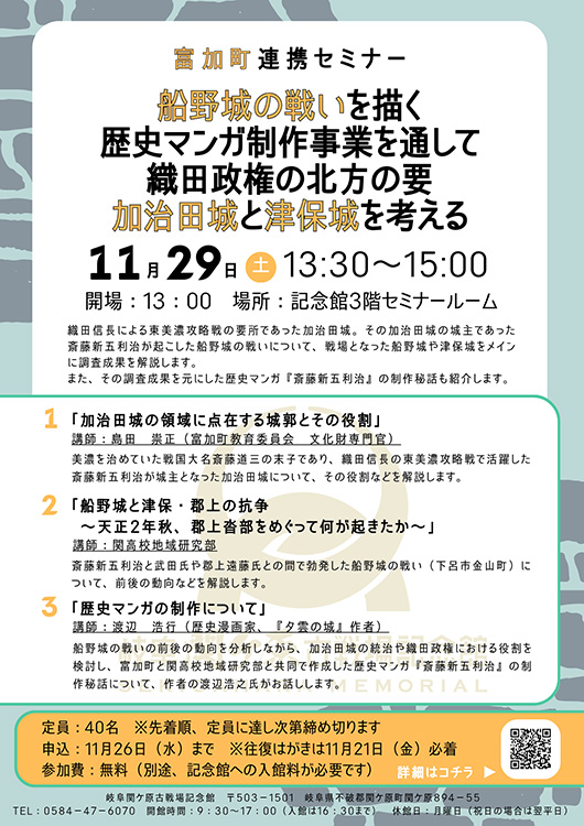 富加町連携セミナー「船野城の戦いを描く歴史マンガ制作事業を通して織田政権の北方の要 加治田城と津保城を考える」 | |