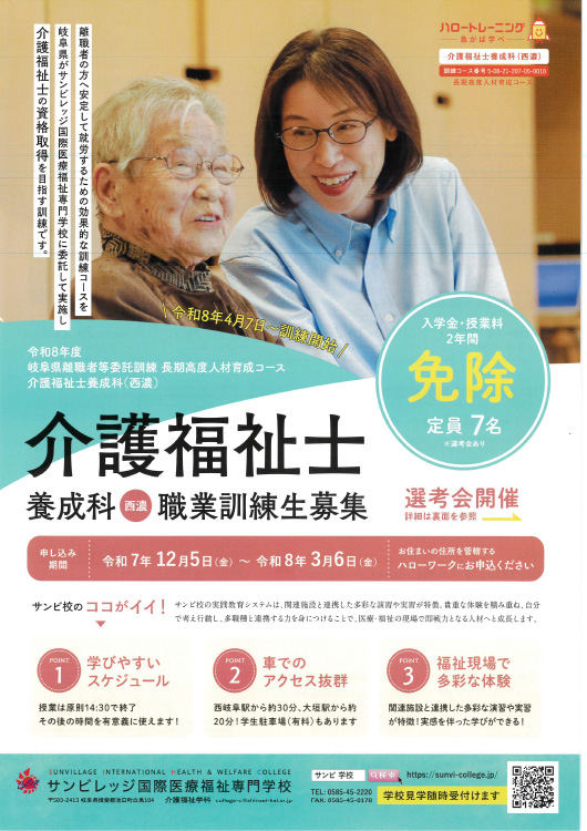 この訓練は、岐阜県が離職者の方が安定的に就労するために効果的な訓練コースをサンビレッジ国際医療福祉専門学校に委託して実施し、介護福祉士の資格取得を目指すものです。