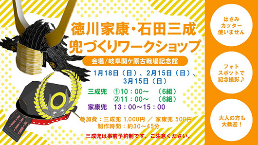 ダンボールを素材とした兜づくりワークショップを開催します。 徳川家康と石田三成の兜をもとに開発したキットを使用して、兜づくりを体験できます。 みなさま、是非ご参加ください。 ■徳川家康兜づくりワークショップ 時間/13:00〜15:00(最終受付14:40) 定員/随時受付 ※会場の状況によりお待ちいただく場合がございます。 参加費/500円 ※別途、入館料が必要です。 申込み方法/当日の会場での申し込みのみ ■石田三成兜づくりワークショップ 時間/ 2月15日…(第一部)10:00〜、(第二部)11:00〜 3月15日…10:00〜12:00(最終受付11:20) 定員/ 2月15日…各部で6組(1組3人)まで 3月15日…随時受付 参加費/1,000円 ※別途、入館料が必要です。 申込み方法/ 2月15日…事前予約(先着順) ※1組様、各日1回のみのお申込みを承ります。 第一部 10時 参加申込フォーム https://www.pref.gifu.lg.jp/ques/questionnaire.php?openid=1189 第二部 11時 参加申込フォーム https://www.pref.gifu.lg.jp/ques/questionnaire.php?openid=1190 3月15日…当日の会場での申し込みのみ ※キットは、子どもでも簡単に組み立てることができます(製作時間30分〜45分程度)。 ※キットのみの販売は行っておりません。 ※作成する兜は、参加する時間帯の兜のみで種類を選ぶことはできません。 ※記念館内(セミナールーム以外)での兜の着用はご遠慮ください。 ---------------------------------------------- ※お申込みなど、詳しくはホームページでご確認ください。 https://sekigahara.pref.gifu.lg.jp/news/p8013/ ---------------------------------------------- |