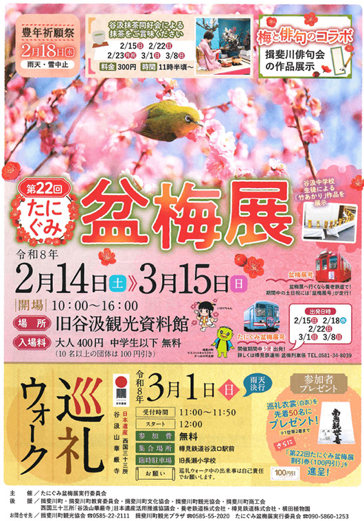丹精込めて育て上げられた美しい梅の香りに包まれて 今年で22回目となる「たにぐみ盆梅展」 丹精込められて育てあげられた、美しい梅がご覧いただけます。 期間中、各種イベントが開催されます。詳しくはチラシでご確認ください。 料金/大人400円、中学生以下無料(10人以上の団体は100円引き) ---------------------------------------------- ※詳しくはホームページでご確認ください。 https://www.kankou-gifu.jp/event/detail_6449.html ---------------------------------------------- |