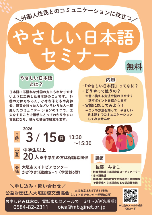 大垣市には現在約7,000人の外国人市民が在住しており、大垣市民の23人に1人にあたります。 地域や職場で外国人とコミュニケーションを取る機会も増えていると思いますが、コミュニケーションが難しいと感じることがあるかもしれません。そんなとき、外国人にもわかりやすいように言葉遣いや表現を工夫した「やさしい日本語」が役立ちます。 このセミナーでは、「やさしい日本語」表現への言い換えや、伝わりやすく話すポイント、外国人にとって難しい日本語とは?など紹介します。ご参加お待ちしております。 【定員】 中学生以上20人(中学生の方は保護者の方と一緒にお申込みください) 【参加費】 無料 【申込】 2月1日(日)〜3月9日(月)。協会窓口、電話、メールでお申込みください。 <おなまえ、電話番号、お住いの市町名>をお知らせください。 ---------------------------------------------- ※お申込みなど、詳しくはホームページでご確認ください。 https://www.i-oiea.jp/bosyu/342_index_msg.html ---------------------------------------------- |