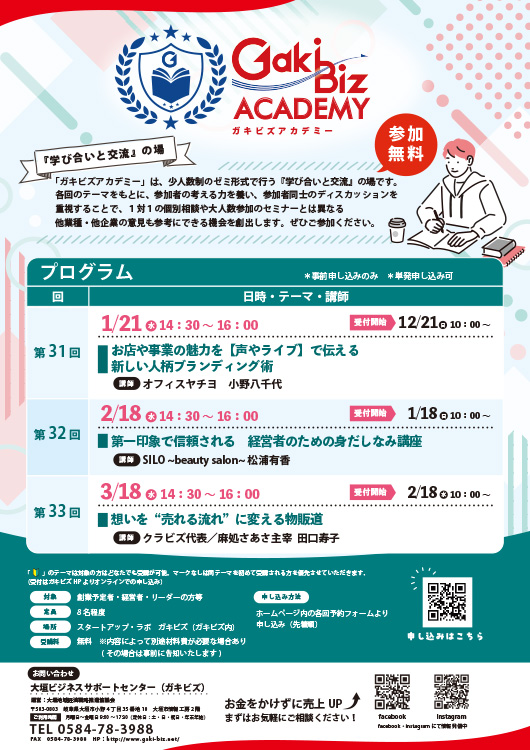 「ガキビズアカデミー」は少人数制のゼミ形式で行う『学び合いと交流の場』です。各回のテーマをもとに、参加者の考える力を養い、参加者同士のディスカッションを重視することで、1対1の個別相談や大人数参加のセミナーとは異なる他業種・他企業の意見も参考にできる機会を創出します。 是非ご参加ください。 とき/ 2026年3月18日(水)14時30分〜16時00分 ところ/ スタートアップ・ラボ ガキビズ (大垣市情報工房2階 大垣ビジネスサポートセンター内) 内容/ 想いを“売れる流れ”に変える物販道 (担当:クラビズ代表/麻処さあさ主宰 田口寿子 氏) 受講料/ 無料(ガキビズの相談回数のカウント対象外です) 定員/ 8名 申込方法/ インターネットのフォームよりお申し込みください。 https://forms.gle/8W4ZLPt6KNXotE9A6 主催/ 大垣地域経済戦略推進協議会 ---------------------------------------------- ※お申込みなど、詳しくはホームページでご確認ください。 https://www.gaki-biz.net/250318academy/ ---------------------------------------------- |