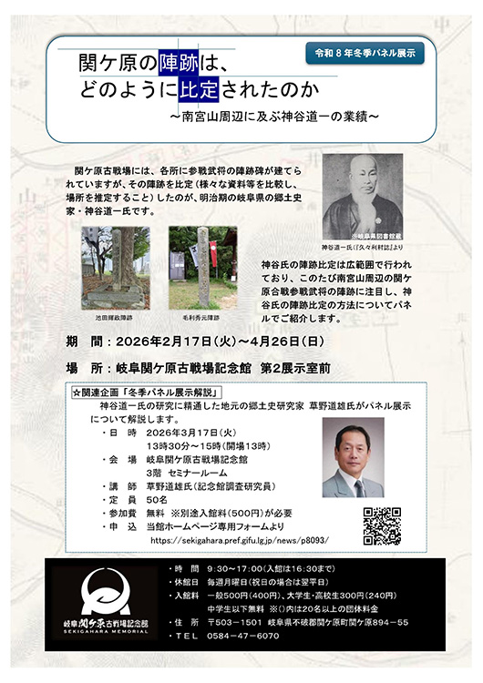 岐阜関ケ原古戦場記念館では、関ケ原合戦参戦武将の布陣地を定める基礎を作ったといわれる、明治期の岐阜県の郷土史家 神谷道一氏の取組みに関するパネル展示を開催します。参戦武将の中から南宮山周辺に布陣した池田輝政・浅野幸長・毛利秀元の陣跡を取り上げ、これらの陣跡の場所がどのような方法で推定されたのかについて、紹介します。 ◆関連企画「冬季パネル展示解説」 日時/3月17日(火)13時30分〜15時 (開場13時) 会場/記念館3階セミナールーム 講師/草野道雄氏(岐阜関ケ原古戦場記念館 調査研究員) 内容/神谷道一氏の研究に精通した地元の郷土史研究家 草野道雄氏がパネル展示について解説します 定員/50名(事前申込・先着順) 参加費/無料 ※別途入館料が必要です 申込方法/記念館HP【専用フォーム】から申し込みください ---------------------------------------------- ※詳しくは、ホームページでご確認ください。 https://sekigahara.pref.gifu.lg.jp/news/p8093/ ---------------------------------------------- |