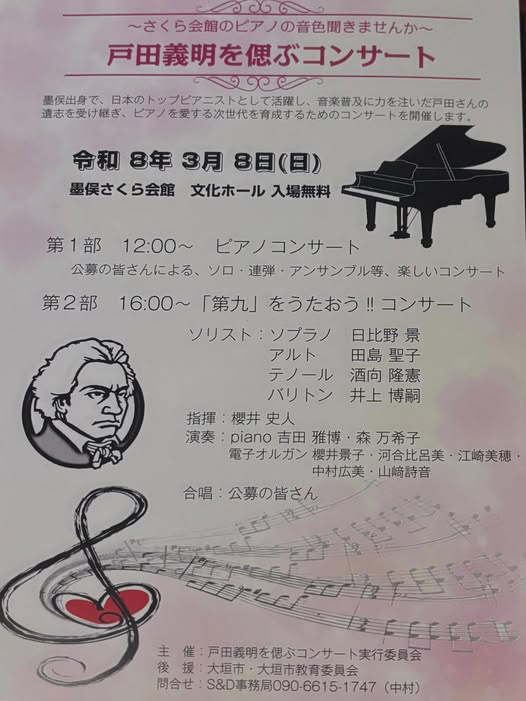 墨俣出身で、日本のトップピアニストとして活躍し、音楽普及に力を注いだ戸田さんの遺志を受け継ぎ、ピアノを愛する次世代を育成するためのコンサートを開催します。 入場は無料です。お近くの方は是非聴きにきてください! 第1部 12:00〜 ピアノコンサート 第2部 16:00〜 「第九」をうたおう!!コンサート ---------------------------------------------- ※詳しくはホームページでご確認ください。 https://www.facebook.com/sanddmusical/posts/pfbid02QF3zcC4PYc4p679Fg8PchMYPfwp29c2Mg3V4vLghKcvScyhb8FbKtcz37vhMMG12l ---------------------------------------------- |