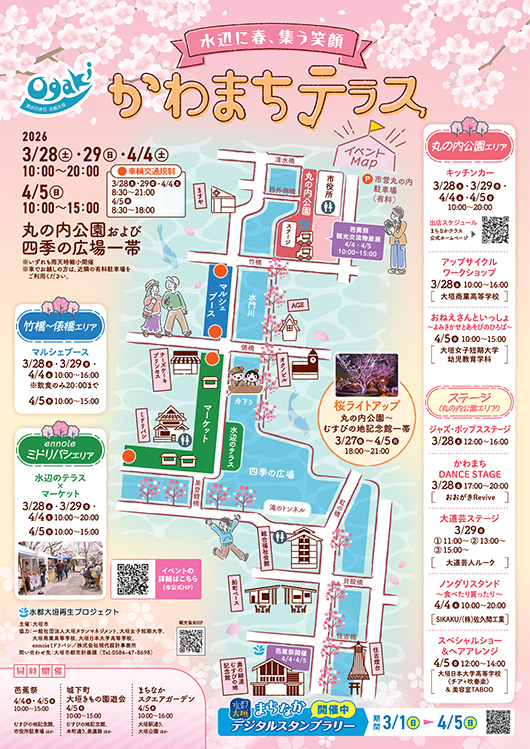丸の内公園から四季の広場までの水辺空間を官民協働でデザインし、水を身近に感じる回遊型イベントです。 春と夏に開催され、多彩なアクテビティや飲食ブース、パフォーマンスなどが行われます。春は水辺のテラス席で桜を見ながら飲食を、夏は水門川を使ったアクテビティが体験でき、季節ごとに異なった水辺を楽しむことができます。 ---------------------------------------------- ※詳しくは、ホームページでご確認ください。 https://www.city.ogaki.lg.jp/0000069134.html ---------------------------------------------- |