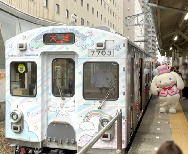 ラッピング電車「養老鉄道×シナモロールみんなをつなぐトレイン」の車内にシナモンのぬいぐるみを設置し、ぬいぐるみとの写真撮影などをお楽しみいただけるほか、なんと!シナモロールが一部区間を電車に乗って、グリーティングもお楽しみいただけます。